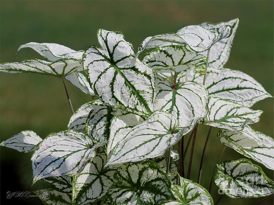 This caladium features a bright white center with green margins and can tolerate full sun.